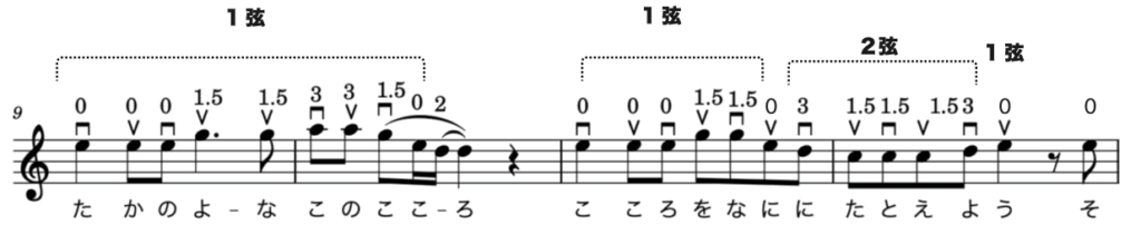 1弓1音で基本的な奏法を習得する。白い線以外の音は使わない。